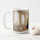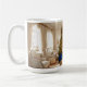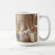 Art mug of a golden-haired girl with a jeweled crown sitting in a beige royal bedroom, blending childhood wonder, grace, and a timeless fairytale mood.