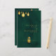 Royal Emerald Grönt Golden Hanging Ljus Bröllop Menu Card. Det här bröllop-menykortet är som lite biet av magi! Framsidan har en vacker grönt med gnistrande guldfärgade ljus-tvillingar över, ge ett magiskt intryck. Du hittar parets namn elegant skriven, tillsammans med bröllop datum och platsen. Baksidan är också grönt, med samma fantastiska guldljus. I toppen står det "Menu" i ett vackert teckensnitt. Nedan hittar du en lista över alla utsökta diskar, från starter till desserter, allt skrivet i elegant guld. Det är en verkligt speciell beröring för bröllop firande.
