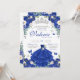 Den här blommigten i elegant innehåller knappar (du kan flytta eller ta bort dem) och vackra blå och vita blommigtar som ro och vattenstånd och ponnyer. Det finns en vacker diamanttiara i silver och all text kan anpassas. All text kan anpassas för ditt speciella tillfälle och andra färg-ändringar finns i Söt Bjud in.