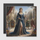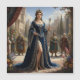 A regal queen, adorned in an elaborate blue velvet gown with silver embroidery and a golden crown, stands holding a scepter in the courtyard of a grand stone palace. She is flanked by several noblemen or guards in medieval attire, amidst lush gardens and architectural details under a bright sky.