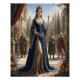 A regal queen, adorned in an elaborate blue velvet gown with silver embroidery and a golden crown, stands holding a scepter in the courtyard of a grand stone palace. She is flanked by several noblemen or guards in medieval attire, amidst lush gardens and architectural details under a bright sky.