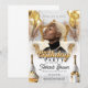 Denna inbjudan har en klassisk känsla med vita och gyllene festliga detaljer, gyllene ballonger och en elegant tronkurs i bakgrunden. Layouten innehåller ett dedikerat utrymme för att ladda upp ditt eget foto och redigera dina evenemangsuppgifter. Det är ett perfekt val för stora firanden eller kungliga temapartyn. Tillgängligt för digital nedladdning eller utskrift direkt via Zazzle, det erbjuder både stil och bekvämlighet.