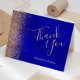 Den här eleganten är det moderna bröllop-kortet som har en gräns av ro guld faux glitter på royalets blå bakgrund. Anpassadet kombinerar ord "Tack" i handskriftsskriptet ro rosa och namn i briden och trimmen med kursivt teckensnitt.