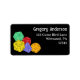 De här returetiketterna innehåller färgfulla illustrationer av uppspelningsspel eller fantasi-spel som ställs in mot en svart bakgrund med ditt namn och adress i vitt.