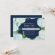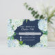 Funktioner original konstnärlig design av Audrey Jeanne. RSVP Svar returkort för bröllopsinbjudningar. En lös krans av vita och blå hortensior sticker ut mot den djupt marinblå bakgrunden. Upphovsrätt, Audrey Jeanne Roberts.