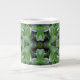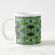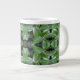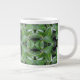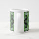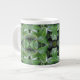 Gå grönt med gummiet träd mönster på detta stora Mugg. Denna tropiska lush-grafik gjordes av ett originalfoto av en garderofolie av HomeWare på löven av ett gummi träd. Löven är släta och blanka, i naturliga skuggor av grönt, från en ljusare grönt i gulten i solljus till en djupare grönt i skuggorna. Löven är plump tittar och deras grönt av ljusa gulter lägger till ett linjärt mönster i fotodesignen.