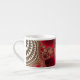 En gnistrande fraktal design med utsmyckade spiraler i mörkt och levande rött, överlagd med guldtråd som metalliska snigelskal och översållad med glittrande rubiner.
