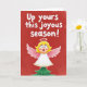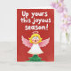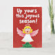 Wish someone a joyful and heartwarming holiday season with this festive Christmas card that's sure to leave a lasting impression! 🎅🏼🎄 Featuring a wide-eyed, innocent cartoon angel perched atop a Christmas tree, the contrast with the bold and explicit text ("Up yours this joyous season!") is sure to bring a laugh. The font is big and bold, making the message impossible to miss. This naughty card is perfect for spreading some unconventional holiday cheer to friends, family, or coworkers who appreciate a good laugh and a bit of dark humor. Get ready to shock and amuse with this unforgettable Christmas card!