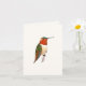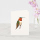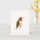Blankt hälsningskort med en Rufous Hummingbird. Rufous Hummingbird är små, stridslystna hummingfåglar som står upp för sin mördande flygnings- och punktmanövreringsförmåga. De tillbringar vintrarna i Mexiko och flyttar nordväst i tidigt vår, främst genom Stillahavslätten.