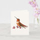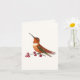 Blankt hälsningskort med en Rufous Hummingbird. Rufous Hummingbird är små, stridslystna hummingfåglar som står upp för sin mördande flygnings- och punktmanövreringsförmåga. De tillbringar vintrarna i Mexiko och flyttar nordväst i tidigt vår, främst genom Stillahavslätten.