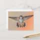 Vykort med en orange rufous hummingbird under flygning, med fjädrarna vingar och svan öppna, tittar direkt på dig - ett roligt-kort för hummingbird, nature and trädgårdslvers. Foto taget i Pasadena, Kalifornien.