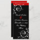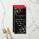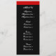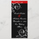 Elegant blommigt rulla löv svart, rött blomstrande bröllop-menykort med vit rulla blad, snurra och krukor och rött på svart bakgrund. Det finns ett rött band med texten överst. Perfekt för utformning av klasser, snyggtar och chic för ett vinterbröllop.