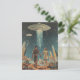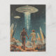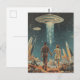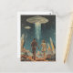 Det här återinspirerade vykortet har ett par som håller händer medan de tillfälligt stjäl på en främmande planet som är på väg mot en UFO med en vit kristallisk stråle som skjuter ner under den.