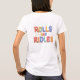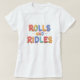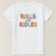 Den här slitstarka t-shirt-skjortan innehåller frasen "Rullar och Riddles" i en lekfull design med flera färgader. "Rullar" i ord återges i ett fet, rundat teckensnitt med en övertoning av varma toner, som går från rött till gult