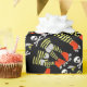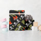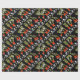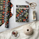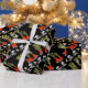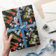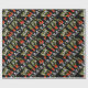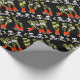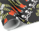 sjal för rullderby themed gåva. Rulle av inpackning av papper skrivs ut med en diagonal rand av rullderby ben i svarten och gult görade randig strumpor, röda skridskor och ror av mördarebin och döskallar.