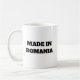 Tillverkad i Rumänien" i svart skrift på vit truckerkeps.