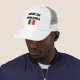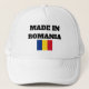 "Made in Rumänien" står i fet svart text och den rumänska flagga är tryckt på en vit truckerkeps.