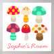 En söt, vacker design av roliga, färgstarka svampar. Barnens illustration är perfekt för en flickas sovrum. Svamprumsfärgat mönster-tema. Barnens roligt. Personlig namn för barn rum.