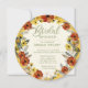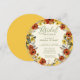 Cirkulär bröllopsfestinladning dekorerad med jordtonade blommor och blad mot en klar gyllene bakgrund. Denna unika inbjudan sätter tonen för din höst- (eller vilken årstid som helst!) firande för den blivande bruden.