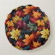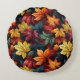 Den här runda formens accentkudde visas i ett fint färgat höst löv-utskrift.
