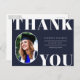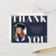 Rund främre fotoram, examens tackkort för seniorklass. Heldragen marinblå bakgrundsfärg, vit fetstil "TACK" och textmallrader för examenens namn, klass år och skola.