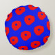 Denna runda kudde har en illustration av röda flingor på en elektrisk blå bakgrund.