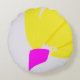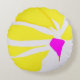 Denna runda kudde består av en stor gult bläckblomma och en fuchsisk stjälk som öppnas upp mot dess lata yta.