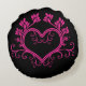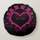Den här fantastiska runda kudden har ett fet, fuchsia-rosa hjärta som är försedd med slitna snurrar och blommigt blomstrar mot en slimmad svart bakgrund. Den romantiska, baroque-inspirerade designen tillför en aning vintage glamor och modern chic till vilket rum som helst - perfekt för rum, vardagsrum eller som påstående biet på ett mysigt lässkåp. Mjuk, pluss och synlig är denna dekorativa kudde perfekt för älskare av feta kontraster och hjärtlig estetik. En vacker gåva till årsjubileum, Valentindagen, eller bara för att säga "jag bryr mig".
