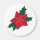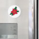 En rund magnet med en röd orange, jultomte, mörk grönt löv och en svart kontur
