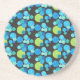 En rund sandsten underlägg eller dricker mat, med "Blue Måne abstrakt mönster i ljusblå blues och neon grönt på svart bakgrund; från en handmålad papper kollagedesign av Judy Adamson.