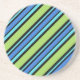 En öga-fångande, rund sandsten Underlägg, med en rullstolsburen mönster i Dazzling Blue, Neon Grönt, Turcos och Black., som är en del av Posh & Painterly Blue Måne-samlingen, är designen från ett handmålat pappert kollage av Judy Adamson.