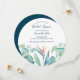 Chic tropiska inbjudningskort för möhippan har ett grund gräns med vattenfärgade blommigtar med lush botaniskt löv och grönt i ett unikt cirkelformat. Anpassa med din möhippa i moderna handskrivna skript och traditionella sans serif-bokstäver. Inbjudningar går tillbaka till rikens marinblå grönt. Perfekt för sommar-, destinations- eller strandmöhippor eller brunch. Om du vill se fler utformningar som den här www.zazzle.com/vginvites