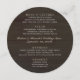 Runt bröllop-meny med mörk träs utseende. Titeln finns i mitten med fyra avsnitt för att ange aptisatorer/hors d’oeuvres, sallad, entrées och dessert eller spelar ingen roll matvaror kommer att serveras vid mottagnings- eller repetitionsmiddagen. Varje avsnitt har plats för upp till fyra linjer text. Mörk brun färg med bruna rubriker och mittskript som kan innehålla parets namn, menyrubrik och datum för händelsen. Menyobjekten är i vit text med versaler. Visas som den runda formen eller välj fyrkant. Pappra uppgraderingar erbjuds.