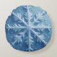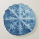 Det är en runda kudde. Den har en snö-kristalldesign i mönster.