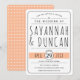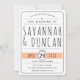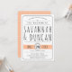 Den här moderna bröllopsinbjudan har en elegant svart och vit typografi med en persikofärgad nyans. Huvudtexten i eleganten presenteras i svart på en vit bakgrund, medan datumet i bröllop står på en charmerande persikobanderoll. Ett svart gräns med rundade hörn ramar inbjudan, vilket ger en sofistikering. På baksidan visas en snyggt geometrisk mönster av vitt kor på persikobakgrunden. Anpassa texten, färg, teckensnittet och mönster till önskad nivå.