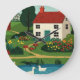 A country house with a red roof and smoking chimneys, surrounded by a blooming garden.