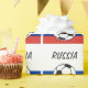 Rysslands Flagga, rött, vitt och blått rand, utgör bakgrunden till en sketch stil svart och vit fotboll.