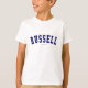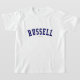 Russell! Är ditt namn Russell? Eller har du en make, en pojkvän, en male familjemedlem eller en manlig vännen namngav Russell? Om så, är denna "baner" skjorta exakt gåvan som du söker efter! Designen presenterar "Russell" i välvd marinbokstäver över bröstkorgen i klassikerhögskolastilsorten.