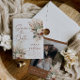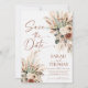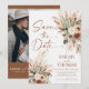 Sätt tonen för din stora dag med detta Rust Boho Terracotta Save The Date-kort. Designen har en fantastisk arrangemang av torkade blommor, eukalyptus och fjäderliknande pampasgräs i en varm, jordnära färgpalett med terrakotta, kräm och dammig salvia.