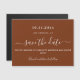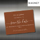En modern och elegant Spara datum magneter för ett bröllop. Rust, förbränd orange bakgrund. Anpassa och lägg till ett datum och namn. Texten: Spara datumet skrivs med ett stort trendig-handskript i stil.