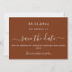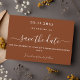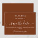 En modern och elegant Spara datum för ett bröllop. Rust, förbränd orange bakgrund. Anpassa och lägg till ett datum och namn. Texten: Spara datumet skrivs med ett stort trendig-handskript i stil.