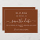 En modern och elegant Spara datum för ett bröllop. Rust, förbränd orange bakgrund. Anpassa och lägg till ett datum och namn. Texten: Spara datumet skrivs med ett stort trendig-handskript i stil.