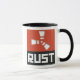 RUST-symbol i Clear på en röd bakgrund med skugga, vit RUST på svart.