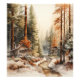 En vattenfärgsrendering på 2 rustiskt präglade hytter i skogen under hösten.