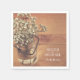 En bröllop papper napkindesign som ger en bild av en mason burk fullt av vita baby utandningsblommor på träbakgrund.
