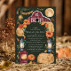 Den här fantastiska bröllopsinbjudan innehåller en rustik lada under en glödande fullt måne, omgiven av autumnala blommigtar, pumpor och vintage. Den djupa gröntens bakgrund och varma jordtoner skapar en mysigt atmosfär, perfekt för en fallande landsbygd i bröllop. Den här utformningen blandar på ett vackert sätt en jordbruks charm med elegansen från en kvällsdag i firande, skapar det som ett idealiskt val för par som kärlek under säsongens hetta.