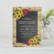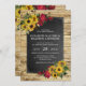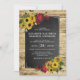 En perfekt för en inbjudan till ett fullbokat bröllop för land, lada, bondgård eller bröllop. Med faux wooden-bakgrund, en vintage schalkboard, sommarsolblommor med gult röd ros på en bädd av grönt blad och en modern bröllop-mall som är lätt att anpassa.