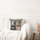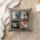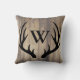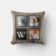 Rustic jordbrukshus-linnans träbakgrund med tre familjefotplatser, svart ramar och ett monogram brev i vitt. Baksidan av kudden har lingträ och svarta hjortar med ett monogram brev.