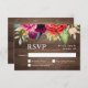 En charmerande, rustik bröllop OSA-kortdesign med en rik lada-bakgrund som är förskönad med en rustik blandad blommigt arrangemang i rostfri orange, djup rosa, burgundisk ro med blandade vilda blommor och grönenergi. Se ge som en avslappnad boho stil som också är smakfull och klassisk. Det är ett val av perfekt för en lada eller en ranch bröllop, land gods bröllop, eller en rustik vindruta bröllop. Anpassa svarsdatumet med önskat OSA. Denna OSA kort har vita kuvert med rakt vita kuvert.