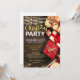 Elegant- och julfestinbjudan med glatt sträng ljus och inslagna gåvor på en lada med träbakgrund.
